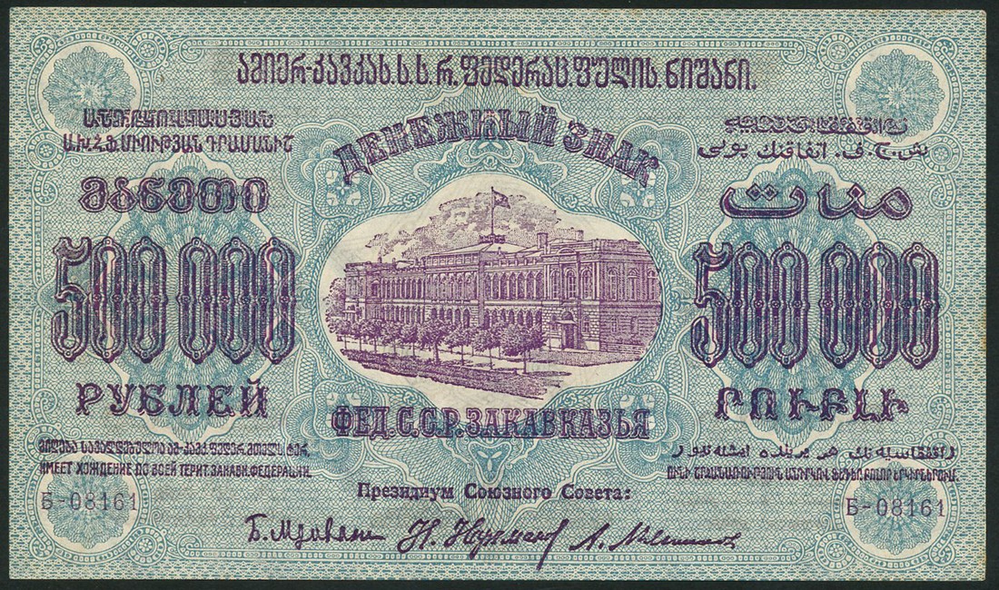 Federation of Socialist Soviet Republics of Transcaucasia, first currency token issues, 1000 rubles, 1923, serial number A-00009, 25,000 rubles, 1923, serial number A-02041, 500,000 rubles, 1923, serial number B-08161