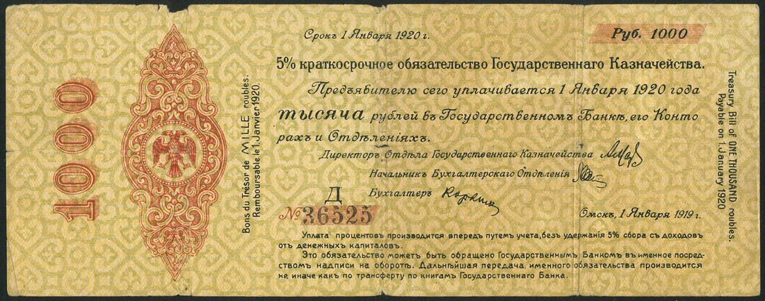 Siberia, 25, 50, 250, 500 and 1000 rubles, 1919, all with double headed eagle at left, value on the outside