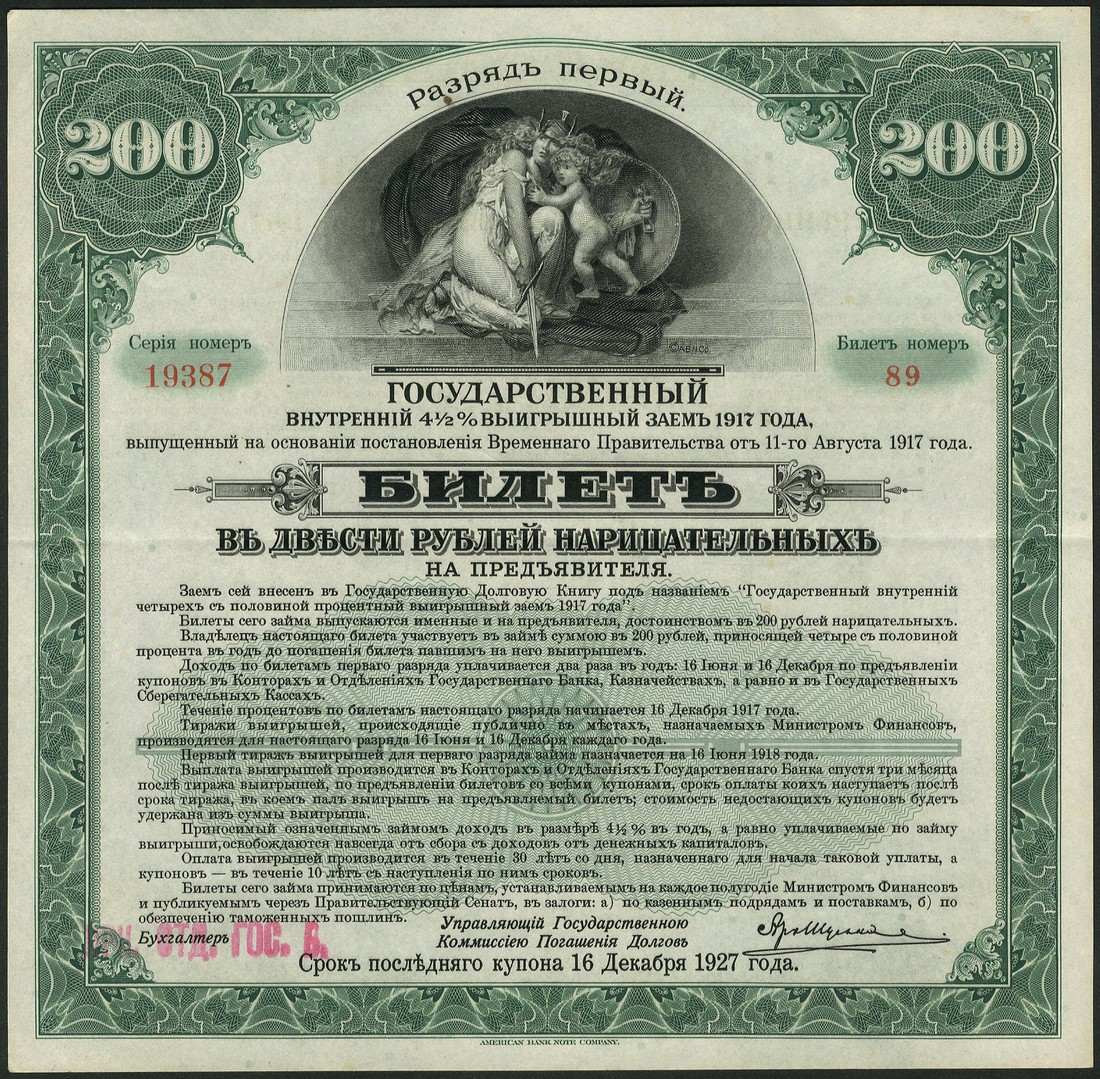 Government Bank, Russia committee savings loan notes issue, 200 rubles, 1917 (1919), green and black, 200 rubles, 1917 (1919), orange and black, both with woman with child top centre, value left and right,
