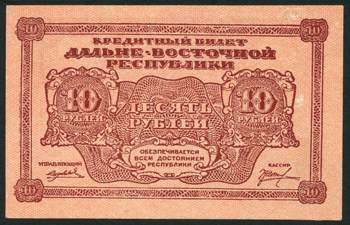 Far Eastern Republic, Russia, 10 rubles, 1920, serial number AA 01003, red on salmon pink, reverse sheaf of wheat, anchor and pickaxe at centre