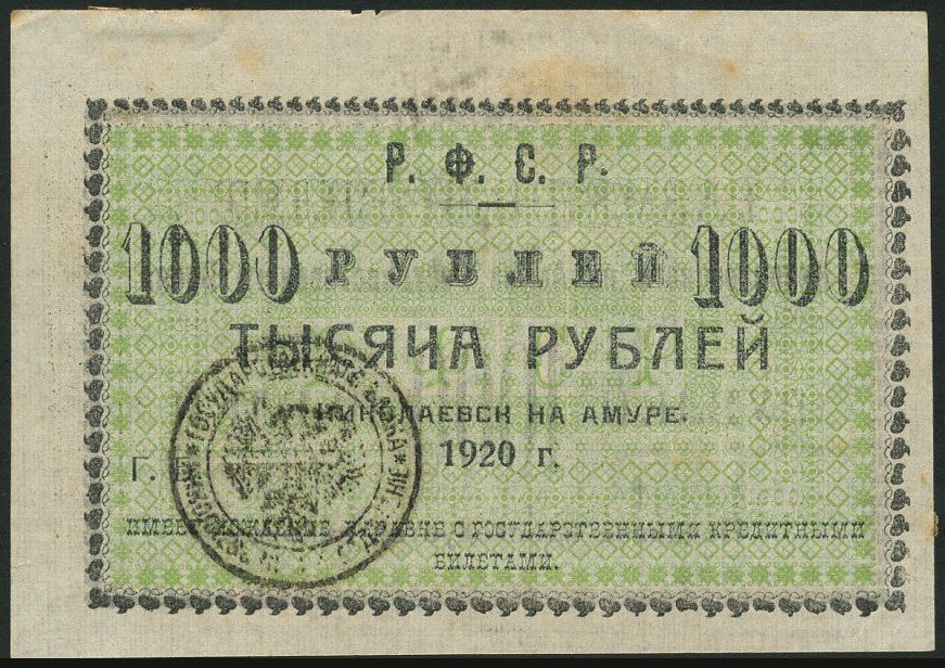 Nikolaevsk-on-Amur Branch Government Bank, Russia, 250 rubles (3), 1000 rubles (3), 1920, first black and red-brown, second black and green, black handstamp at low left