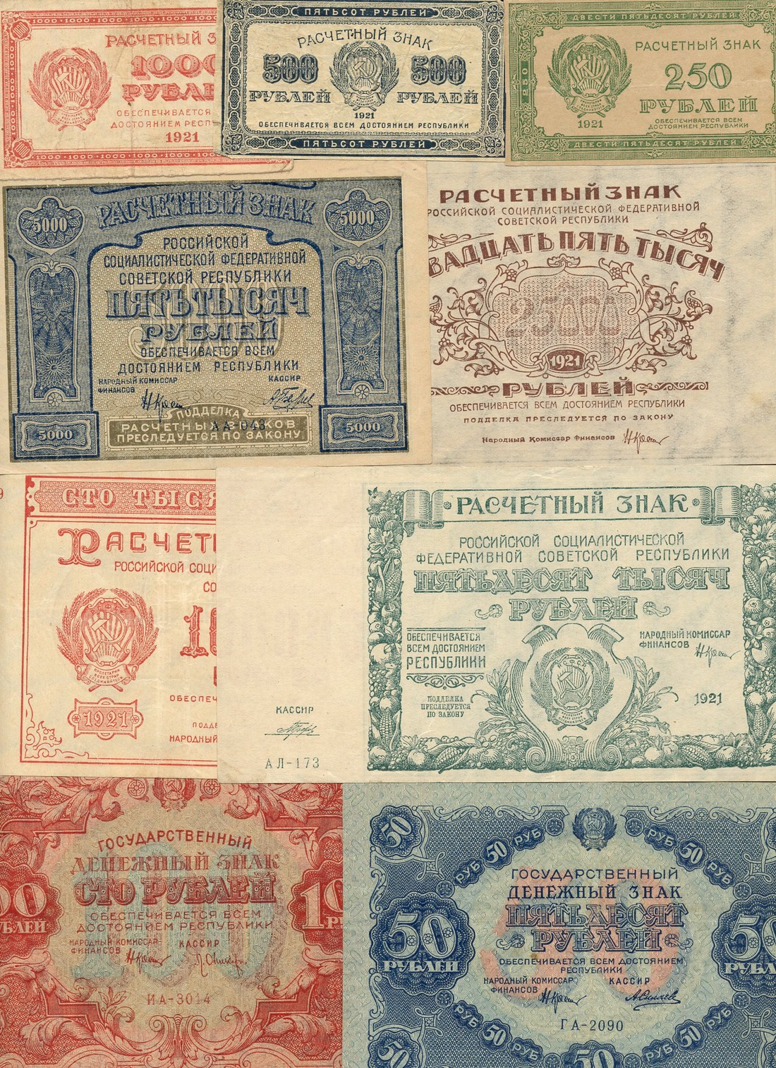 State Currency Notes, Russia, a set of the 1921 issue comprising 25, 50, 1000, 5000, 25000, 50000 and 100000 rubles, also State Currency Notes, a set of the 1922 issue comprising 1, 3, 10, 25, 50, 100 and 500 rubles