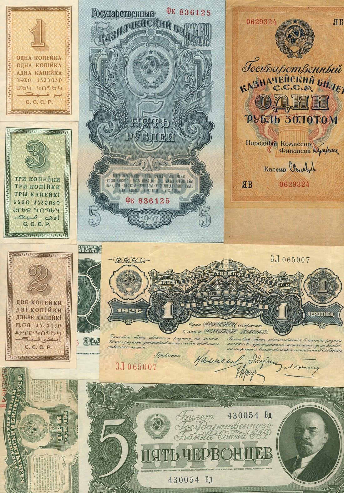 Russia, a group comprising, small change notes, 1, 2 and 3 rubles, 1924, State Currency notes, 3 rubles, 1925, 1 chervontz, 1926, 5 chervontsev, 1928, and 5 chervontsa, 1937, also State Treasury notes, 1 gold ruble, 1928