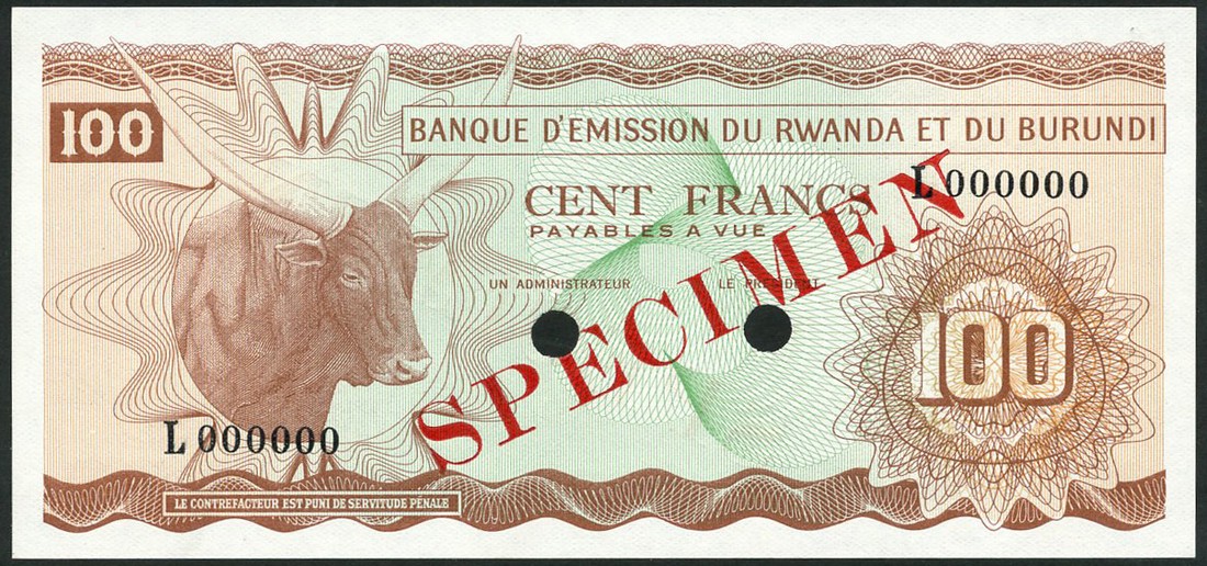 (†) Banque d'Emission du Rwanda et du Burundi, specimen colour trial 100 Francs, ND (c.1960), serial number L000000, brown on pale green and tan underprint, zebu at left, value in guilloche at right, reverse value repeated three times set in ornate geometric patterns, overprinted SPECIMEN in red diagonally on obverse and reverse, two punch holes
