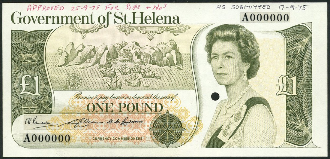 (†) Government of Saint Helena, specimen proof £1 (2), ND (1975), the first no serial numbers and no signatures, the second serial number A000000 and three signatures all in overlay traces, both deep olive-green on orange underprint, view of island with sailing ships at left, portrait of Queen Elizabeth II at right, reverse stylised £ sign at centre, arms with incorrect spelling ANGLAE in motto at left, ship shield at right, one punch hole