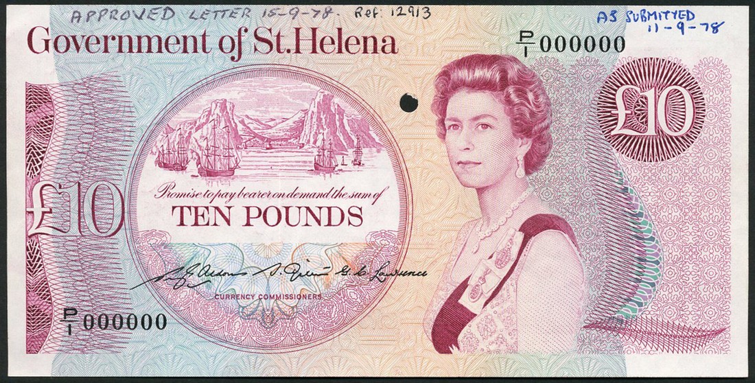 (†) Government of Saint Helena, a group of specimen proofs of the ND (1976-79) Issues, all zero serial numbers, comprising 50 Pence (2), purple; £1, olive-green; £5, signature 1, blue, incorrect spelling of ANGLAE; and £10, signature 2, pale red, all portrait of Queen Elizabeth II at right, island views at left, reverse arms, value and patterns, one punch hole; also original envelope used for submission of proofs