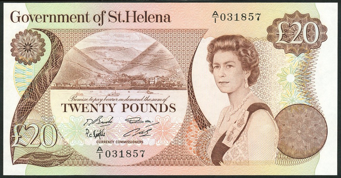 a mixed group of notes including, Government of Saint Helena, 50 pence, prefix V/1, violet, £1, prefix A/1, olive, £5, prefix H/1, turquoise, and £20, brown, prefix A/1, all ND (1976-1981), all Elizabeth II and arms, Tresorerie de Noumea, New Caledonia, 1 franc, 29 March 1943, serial number 209655, blue and white, mining scenes, reverse blue and white, Cross of Lorraine and stag head at centre, Litzmannstadt, additional lunch scrip ('Zus-Mittag'), black text on brown paper with red handstamp 'Nachtarbeit', and Merchants Change Association, unissued 50 cents, Brooklyn, July 1862, black and white with blue protector at centre