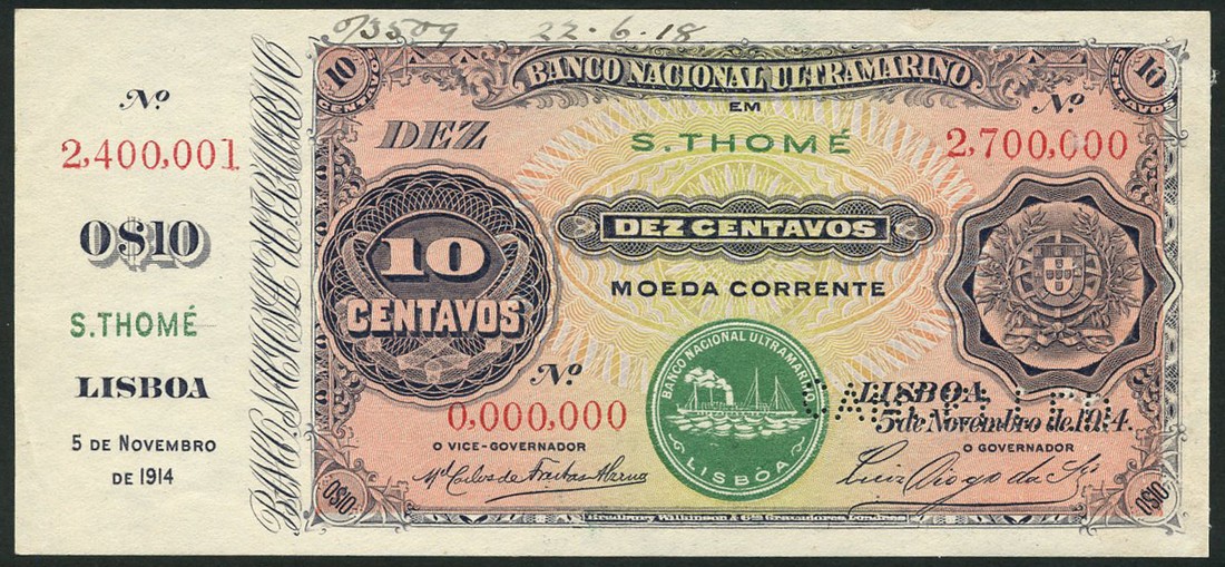 (†) Banco Nacional Ultramarino, Angola, printer's archival specimen 10 Centavos with counterfoil, 5 November 1914, serial run 0,000,000 to 2,700,000, purple on multicoloured underprint, value at left, arms at right, green overprint LOANDA at upper centre, steamship seal Type I at lower centre, reverse blue on yellow and pale green underprint, allegorical woman looking out at sailing ships, perforated CANCELLED
