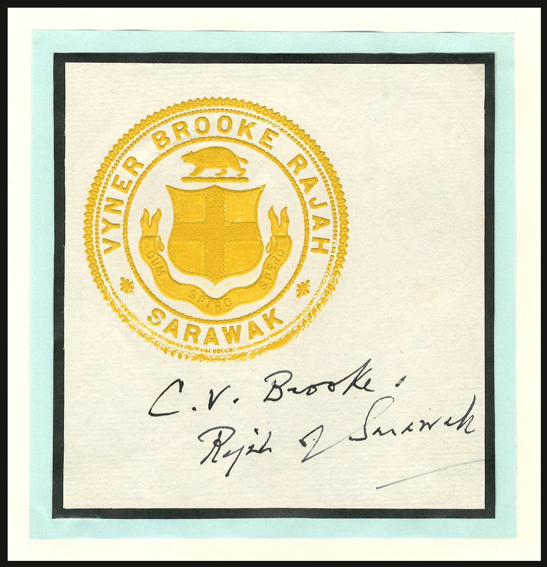 Sarawak, an embossed seal on paper, signed by Sir Charles Vyner Brook, hand coloured yellow, arms at centre, signed 'C.V. Brook Rajah of Sarawak',