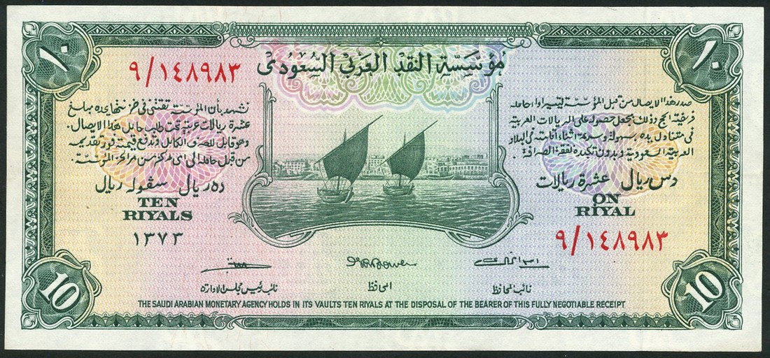 (x) Saudi Arabian Monetary Authority, 10 riyals, ND (1954), serial number 9/148983, dark green on multicolour underprint, dhows at centre, reverse, palm tree with crossed swords at left and right