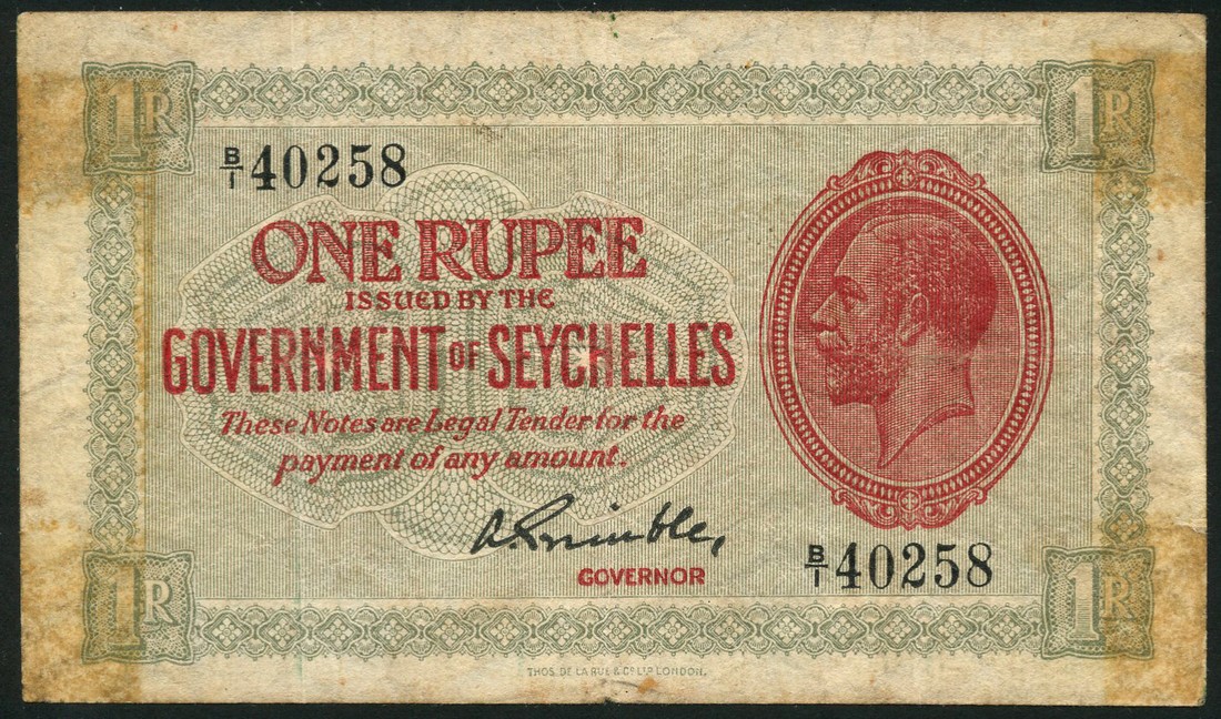 (x) Government of Seychelles, 1 Rupee, ND (1936), serial number B/1 40258, signature Arthur Francis Grimble, greenish grey and red, King George V at right, value in each corner, uniface