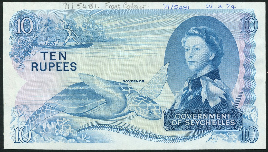 (†) Government of Seychelles, printer's archival specimen 10 Rupees, 1 January 1974, serial run A/1 350001 to 450000, signature Colin Hamilton Allan; also specimen colour proof 10 Rupees, ND (1974), no serial numbers, no signature, both light blue on multicoloured underprint, Annigoni portrait of Queen Elizabeth II in regalia of the Order of the Garter at right, sea tortoise at lower left, reverse value in ornate geometric pattern