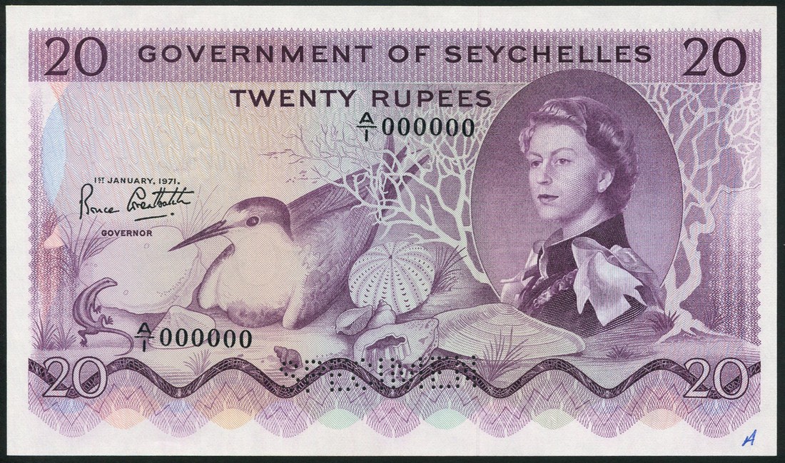 (†) Government of Seychelles, specimen 20 Rupees, 1 January 1971, serial number A/1 000000, signature Bruce Greatbatch, purple on multicoloured underprint, Annigoni portrait of Queen Elizabeth II in regalia of the Order of the Garter at right, skink lizard, sooty tern and coral at lower left, reverse value in ornate geometric pattern, perforated SPECIMEN