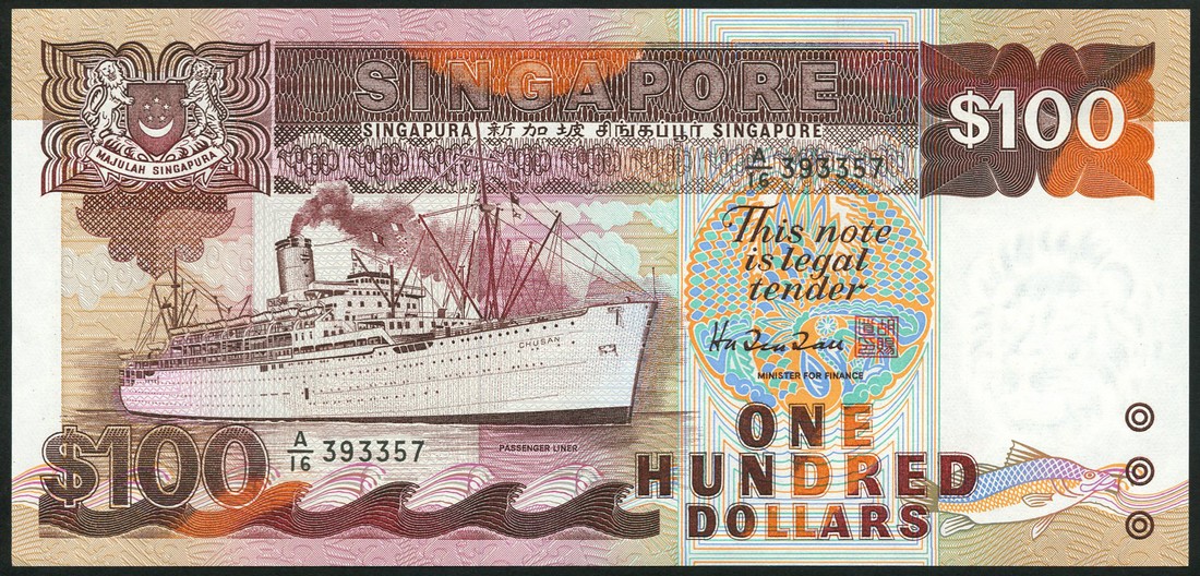 Board of Commissioners of Currency, Singapore, 2 dollars, ND (1981), serial number NR819929, 10 dollars, ND (1988), serial number C/26 108991, 100 dollars, ND (intro 1985), serial number A/16 393357, all depicting different types of boat on front