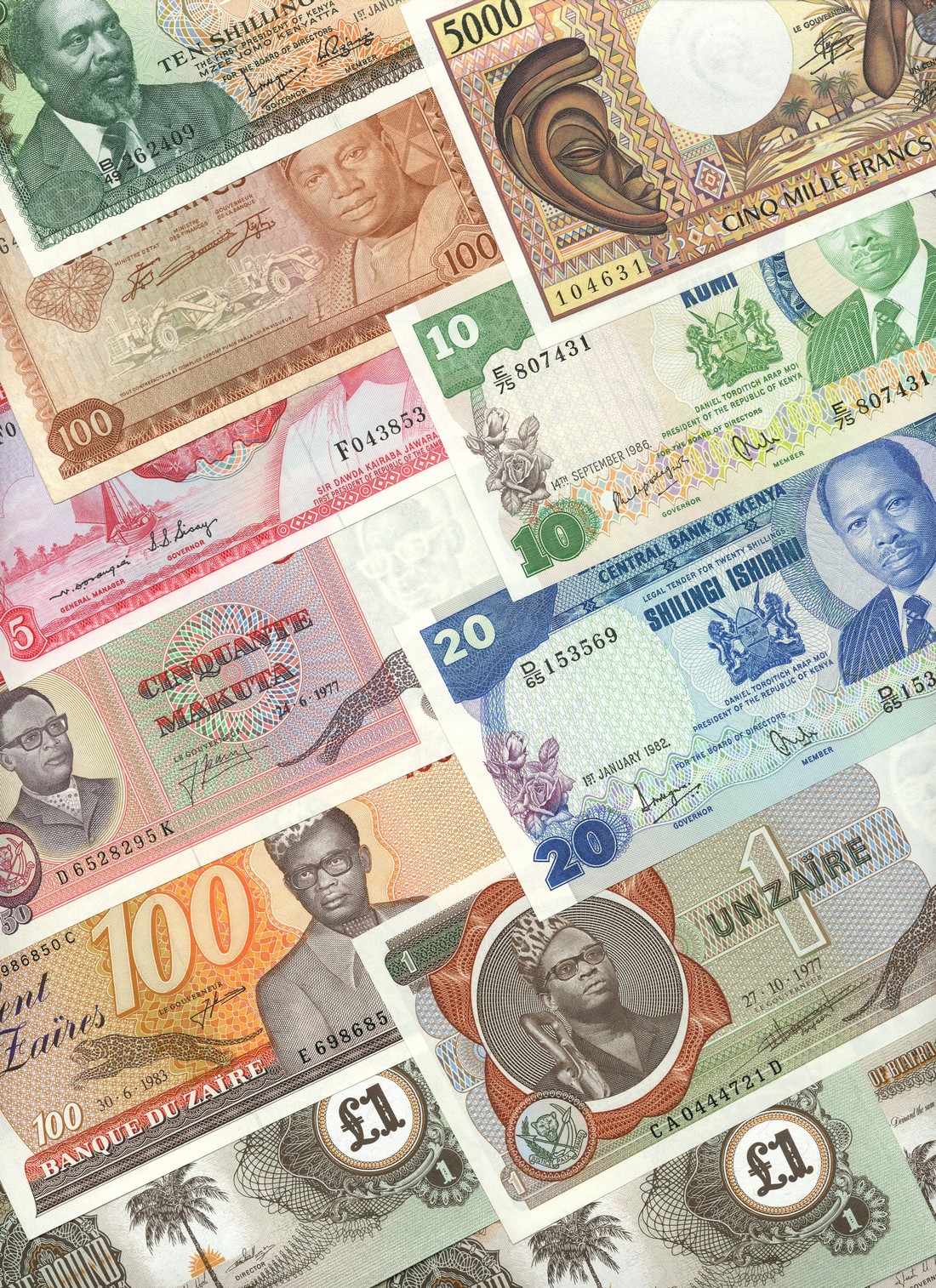 (x) Africa, a selection comprising Tchad, 5000 francs, ND (1984), brown and yellow, woman with basket at right, mask at left, Gambia, 5 dalasi, red, 10 dalasi, green, Mali, 100 francs, 1960, brown, Zaire 1 zaire, 1977, 50 makuta, 1977, red, Kenya, 10 shillings, 1975, 10 shillings (12), 1986, 20 shillings, 1982, 50 shillings (2), 1986,1988, 200 shillings, 1989, Biafra £1 (20), 1968, Tanzania, 10 shillings, ND (1978), ZY replacement, Ghana 10 shillings, 1963, green and Zaire 1 zaire (3), 5 zaires, 1977, 10 zaires (3),1982, and 100 zaires, 1983