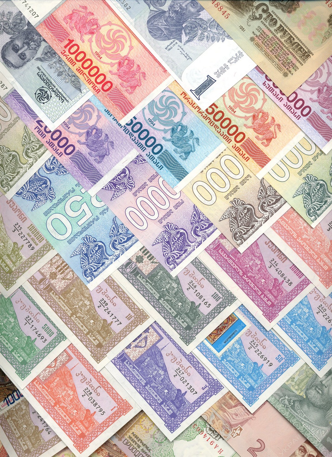 a group of mixed world notes, from various countries including, Georgia, Ukraine, Transdniestria, also a selection of Bavarian POW army stamp currency