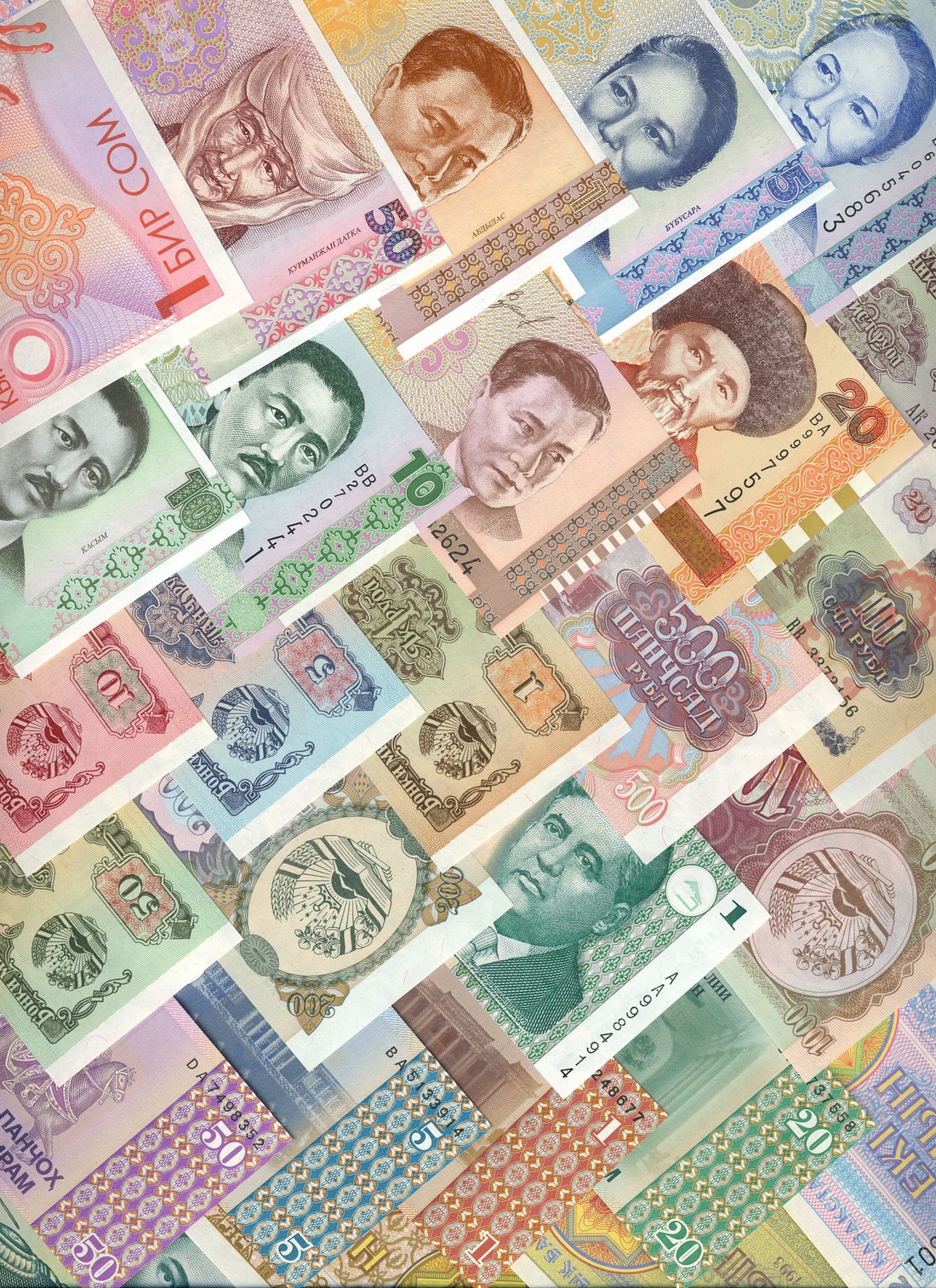 a mixed group of world banknotes, from countries including Kyrgystan, Tajikistan, Kazakhstan, many denomninations, all modern issues