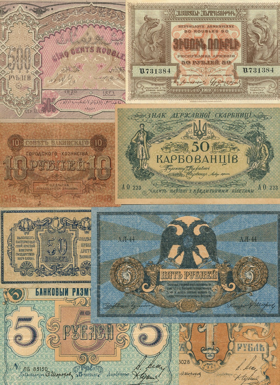 A mixed group comprising Armenia, 50 rubles, 1919, Azerbaijan, 500 rubles, 1920 and 250000 rubles, 1922, latvia, 500 rubles, 1920, Ukraine, 50 karbovantsiv, ND (1918) and 500 hryven, 1918, Norway, 1 krone, 1917, and a small group of others,