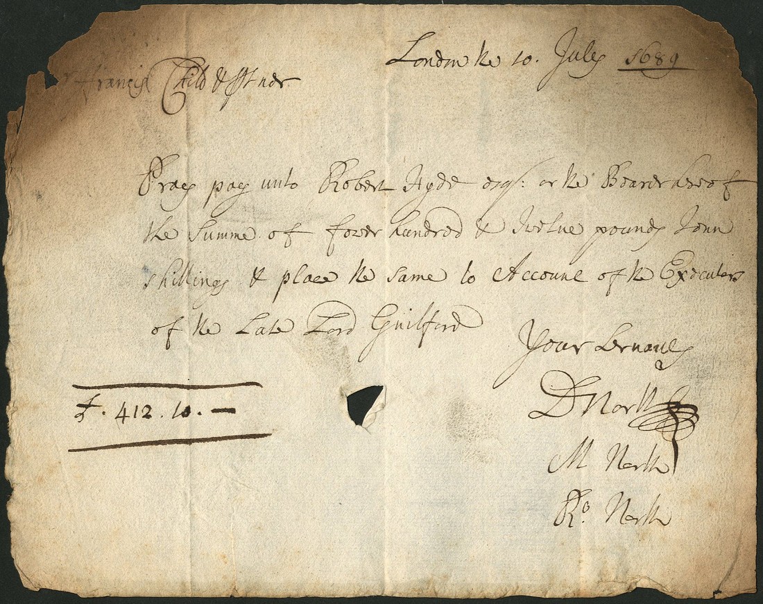 Francis Child & Co., a cheque dated London, 10th July 1689, black text on toned card like paper in the amount of £412 and 10 shillings and payable to Robert Hyde to be placed to the account of the Executors of the late Lord Guildford