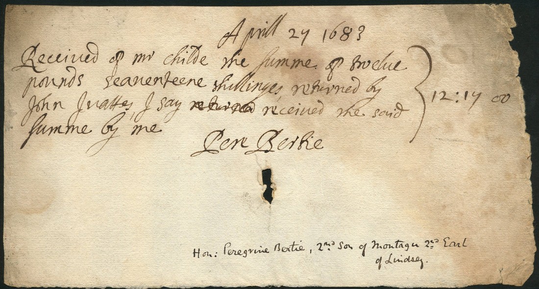 Francis Child & Co., a bill presented to Francis Child for Venison pasty etc and dated 1704, receipts (2) to Francis Child and dated 1688, also a receipt for £12/17 shillings and dated 27th April 1683 and signed by Perg. Betie (Hon. Peregrine Bertie, 2nd son of Montagu, 2nd Earl of Lindsey)