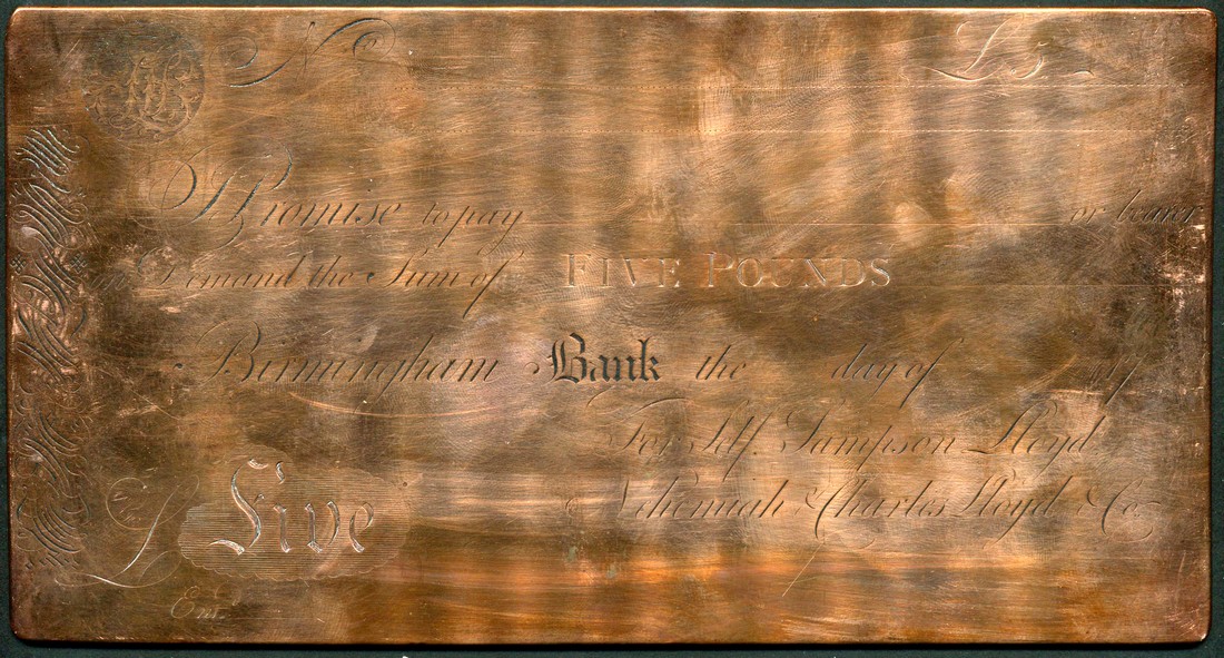 (x) Birmingham Bank (Self, Sampson Lloyd, Nehemiah & Charles Lloyd), a brass printing plate for £5, 17-, bankers initials at top right, value at low right and top left