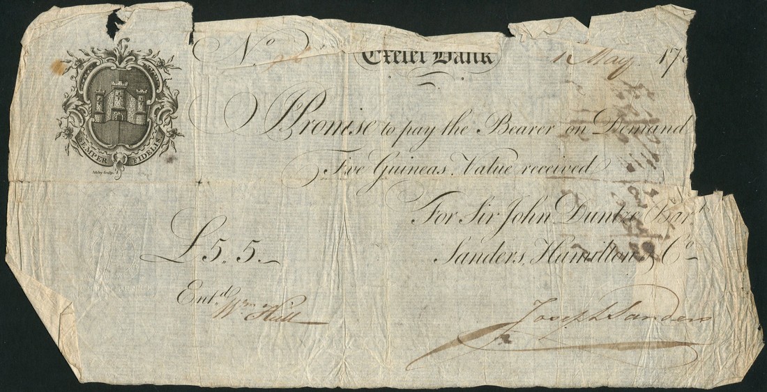 Exeter Bank, 5 guineas, 1 May 178?, serial number 95, black and white, arms at left, for Sir John Duntze, Sanders, Hamilton & Co , manuscript signature of Joseph Sanders