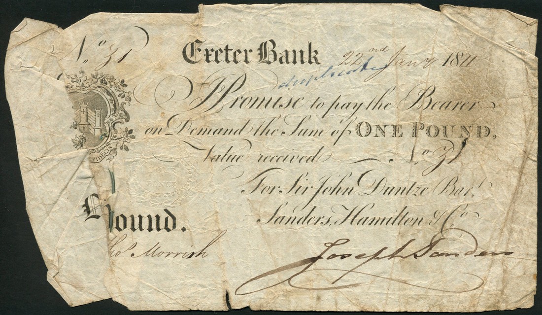 Exeter Bank, £1 (6), 1809 (3) 1811 (3), black and white, arms top left, various partnerships