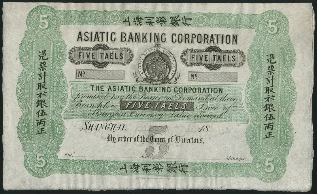 Asiatic Banking Corporation, China, specimen 5 taels, Shanghai, 18- (ca 1862-1866), black, green and white, arms top centre, value in black tablet at centre, value top left and right and at each corner, English text in field, Chinese text top centre and at left and right borders