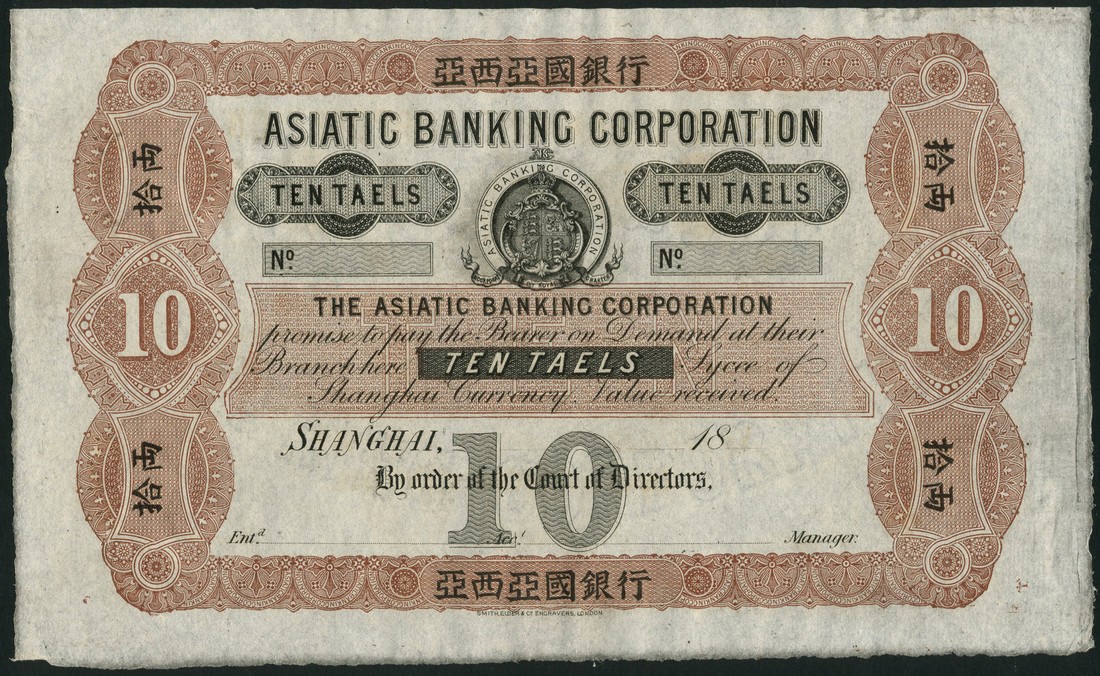Asiatic Banking Corporation, China, specimen 10 taels, Shanghai, 18- (ca 1862-1866), black, brown and white, arms top centre, value in black tablet at centre, value top left and right and at each corner, English text in field, Chinese text top centre and at left and right borders