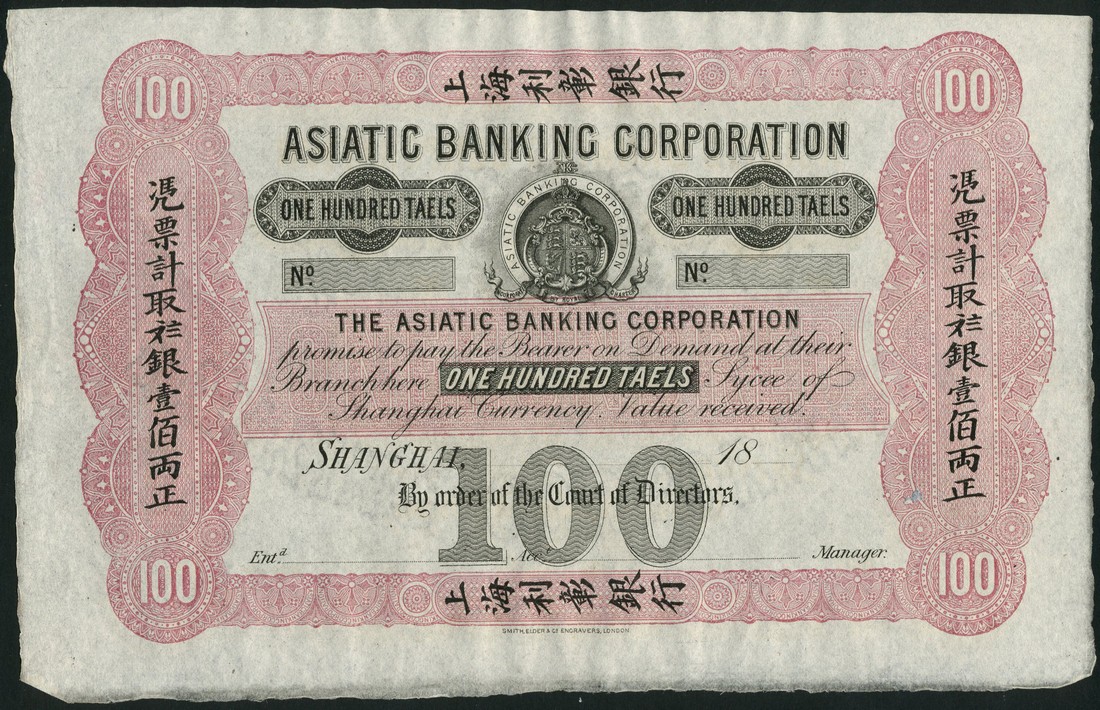 Asiatic Banking Corporation, China, specimen 100 taels, Shanghai, 18- (ca 1862-1866), black, pink-mauve and white, arms top centre, value in black tablet at centre, value top left and right and at each corner, English text in field, Chinese text top centre and at left and right borders