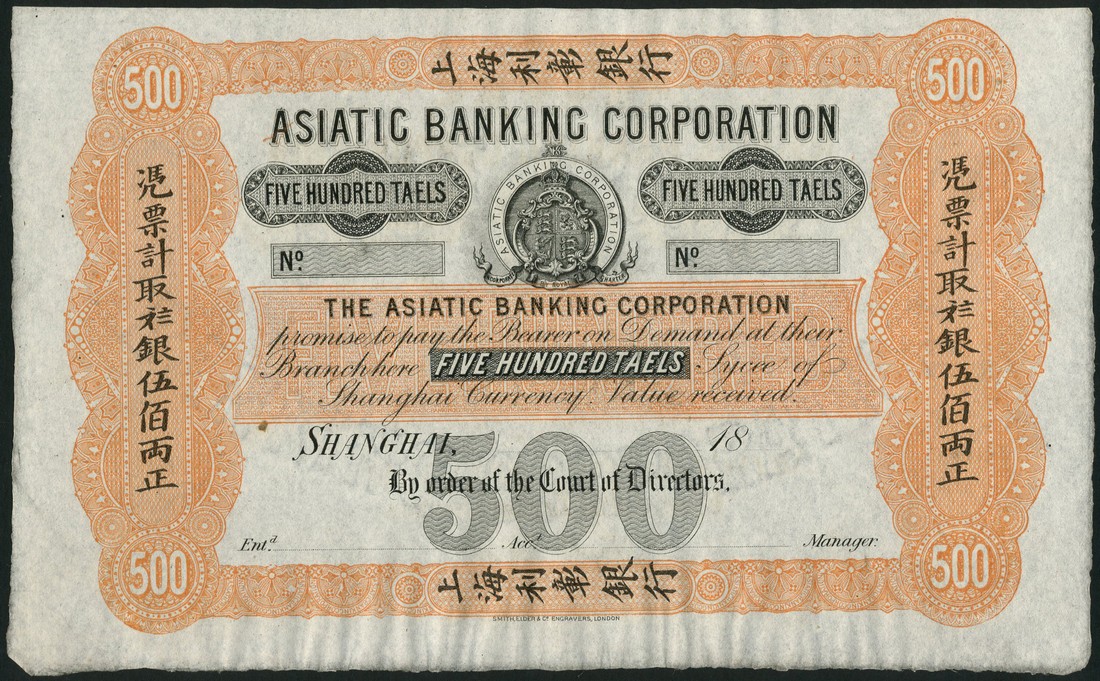 Asiatic Banking Corporation, China, specimen 500 taels, Shanghai, 18- (ca 1862-1866), black, orange and white, arms top centre, value in black tablet at centre, value top left and right and at each corner, English text in field, Chinese text top centre and at left and right borders