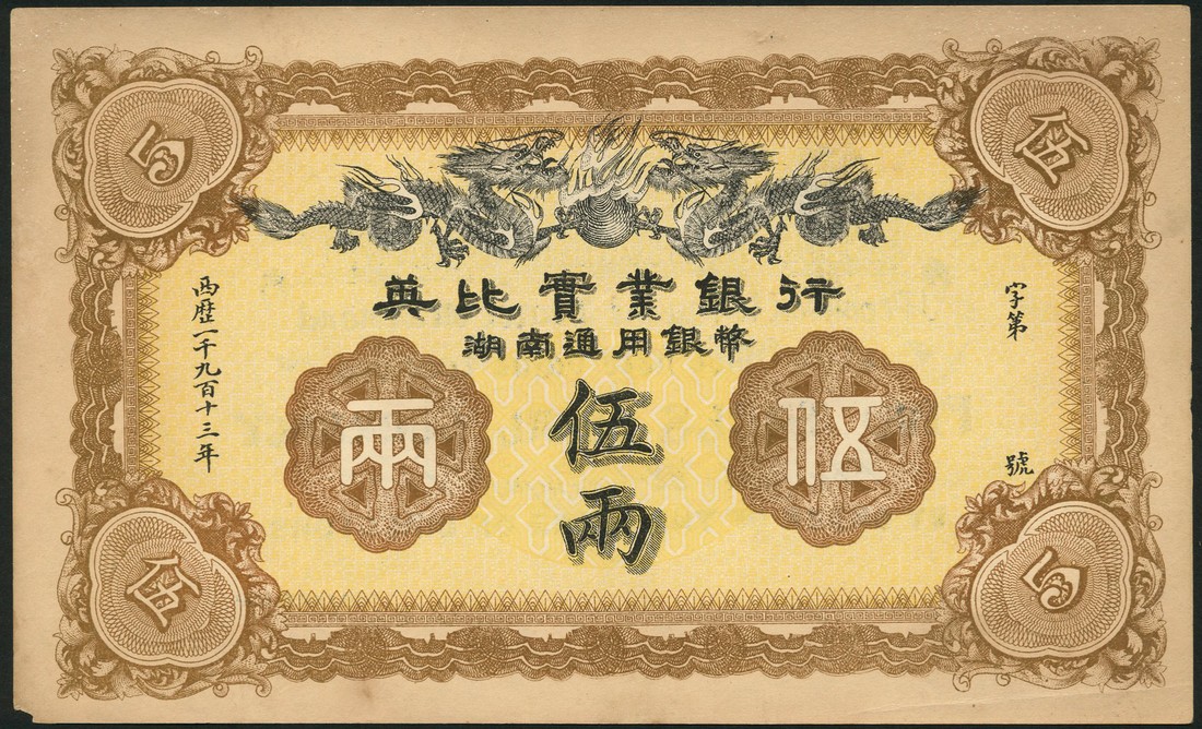 British and Belgian Industrial Bank of China LTD, 5 taels, Changsha, 22 August 1913, brown and pale yellow, dragon top left and right reverse orange and blue