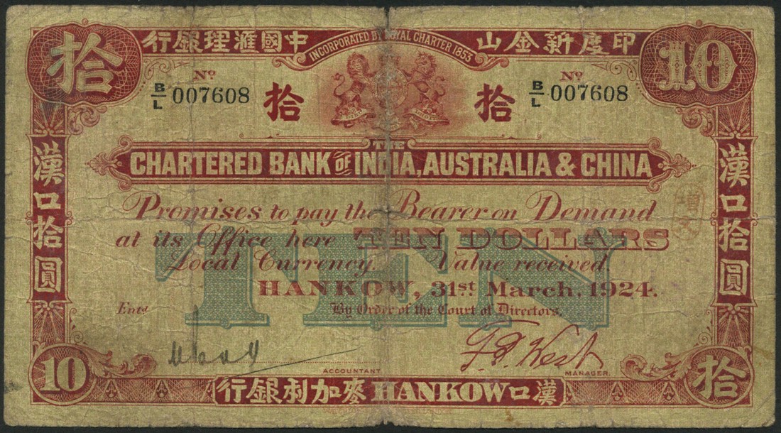 Chartered Bank of India, Australia and China, $5, Hankow, 1 March 1921, prefix A/K, green and red value, $10, Hankow, 31 March 1924, prefix B/L, red and value in blue, both arms top centre and manuscript signature low left