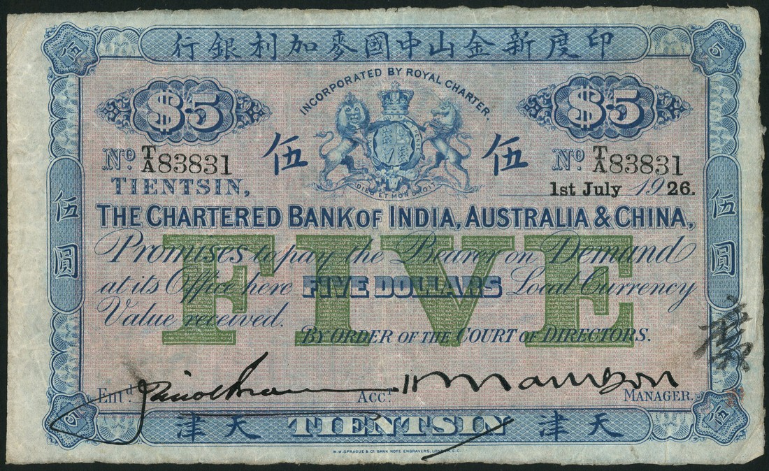 Chartered Bank of India, Australia and China, $5, Tientsin, 1 July 1926, serial number T/A 83831, blue and pink and value in green low centre, arms top centre, manuscript signature low left, reverse green