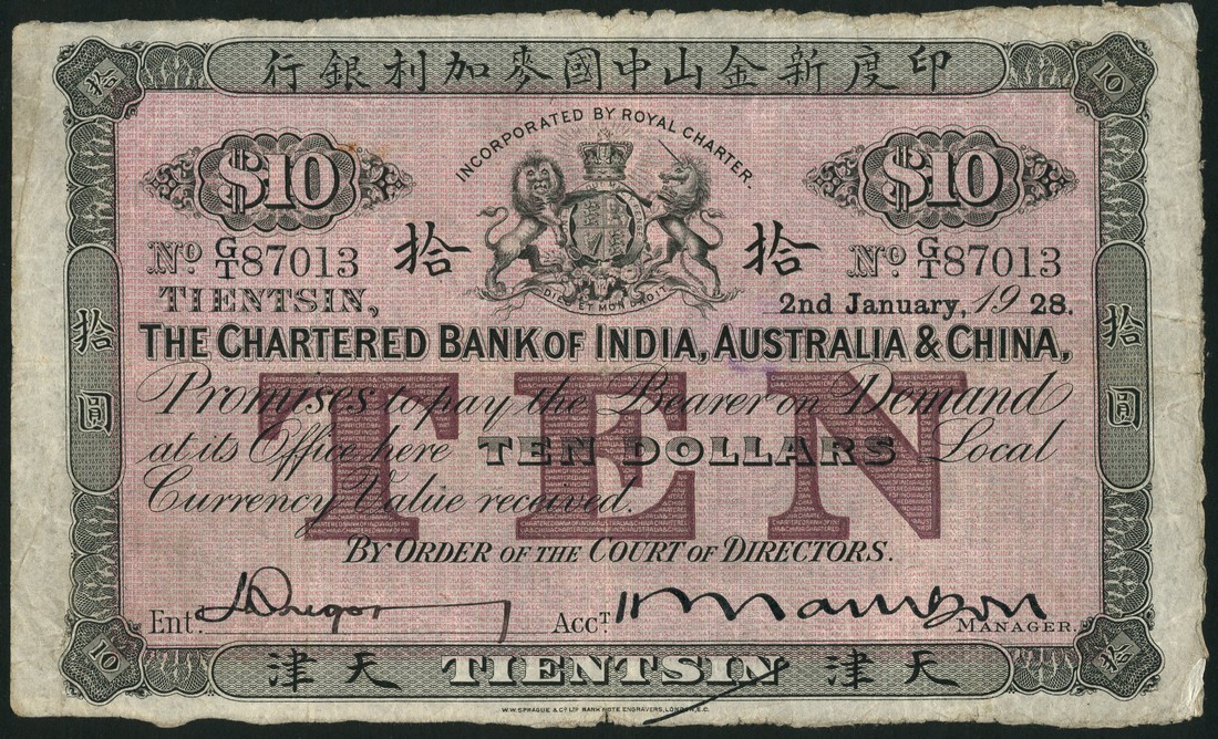 Chartered Bank of India, Australia and China, $10, Tientsin, 2 January 1928, serial number G/T 87013, black and pink and value in violet low centre, arms top centre, manuscript signature low left, reverse grey