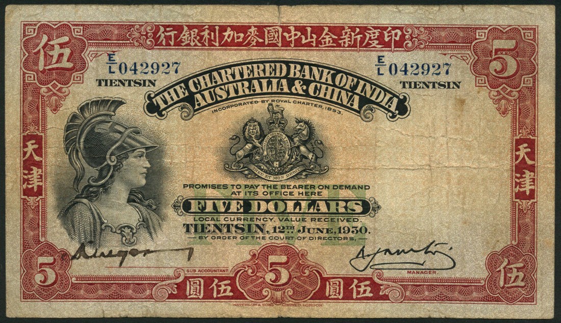 Chartered Bank of India, Australia and China, $5, Tientsin, 12 June 1930, serial number E/L 042927, red and pale orange, value in green low centre, arms top centre, helmeted female head at left, manuscript signature low left, reverse red and pale green, boat on canal right centre