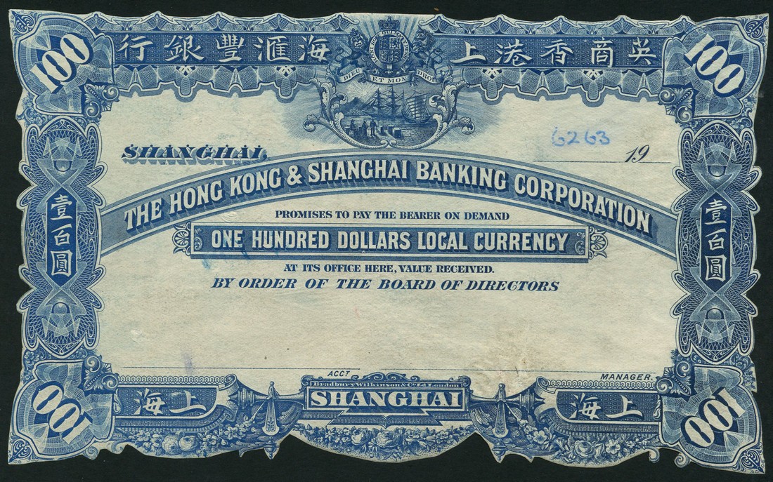 Hong Kong and Shanghai Banking Corporation, China, obverse die proof for $100, Shanghai, 19- (ca 1904), blue and white, bank arms top centre, value at centre and at each corner