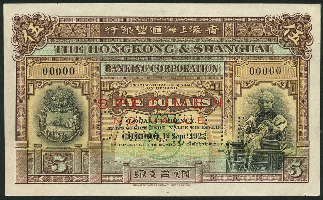 Hong Kong and Shanghai Banking Corporation, colour trial $5, Cheefoo, 1st September 1922, zero serial numbers, brown and multicoloured, value in green low centre, arms at left, woman at loom at right, reverse browm, Bank building at centre