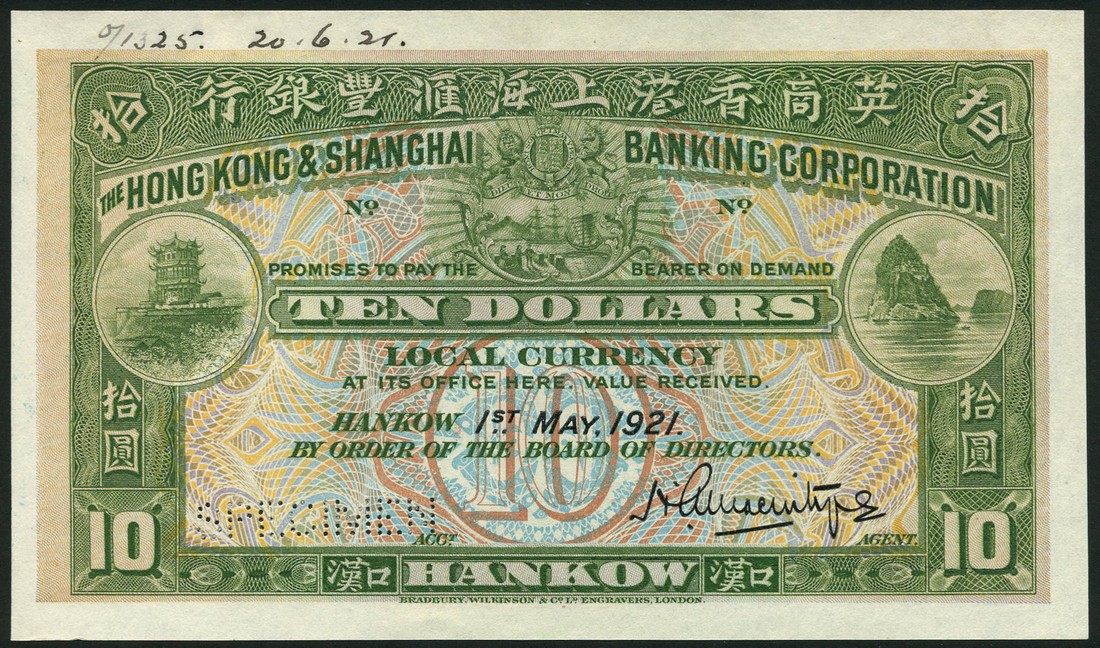 Hong Kong and Shanghai Banking Corporation, specimen $10, Hankow, 1 May 1921, no serial numbers, green and multicoloured, the Arms of the Bank top centre, fortress at left, rock at right, both landmarks on the Yangtze Kiang river, printed signature of H.A.Macintyre low right, reverse blue-green and pale red, Hankow branch bank building at centre, value at each corner