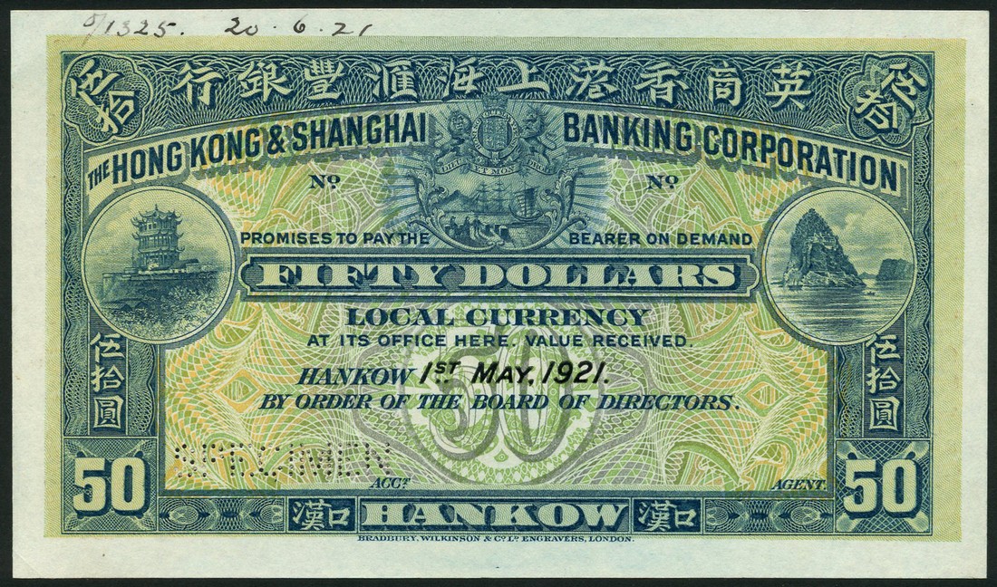 Hong Kong and Shanghai Banking Corporation, specimen $50, Hankow, 1 May 1921, no serial numbers, blue, green and pale orange, the Arms of the Bank top centre, fortress at left, rock at right, both landmarks on the Yangtze Kiang river, printed singature of H.A.Macintyre low right, reverse orange, red and green, Hankow branch bank building at centre, value at each corner
