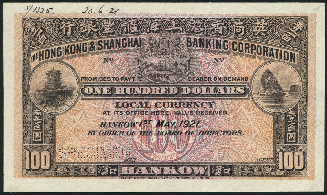 Hong Kong and Shanghai Banking Corporation, specimen $100, Hankow, 1 May 1921, no serial numbers, purple and multicoloured, the Arms of the Bank top centre, fortress at left, rock at right, both landmarks on the Yangtze Kiang river, printed signature of H.A.Macintyre low right, reverse purple and pale blue, Hankow branch bank building at centre, value at each corner