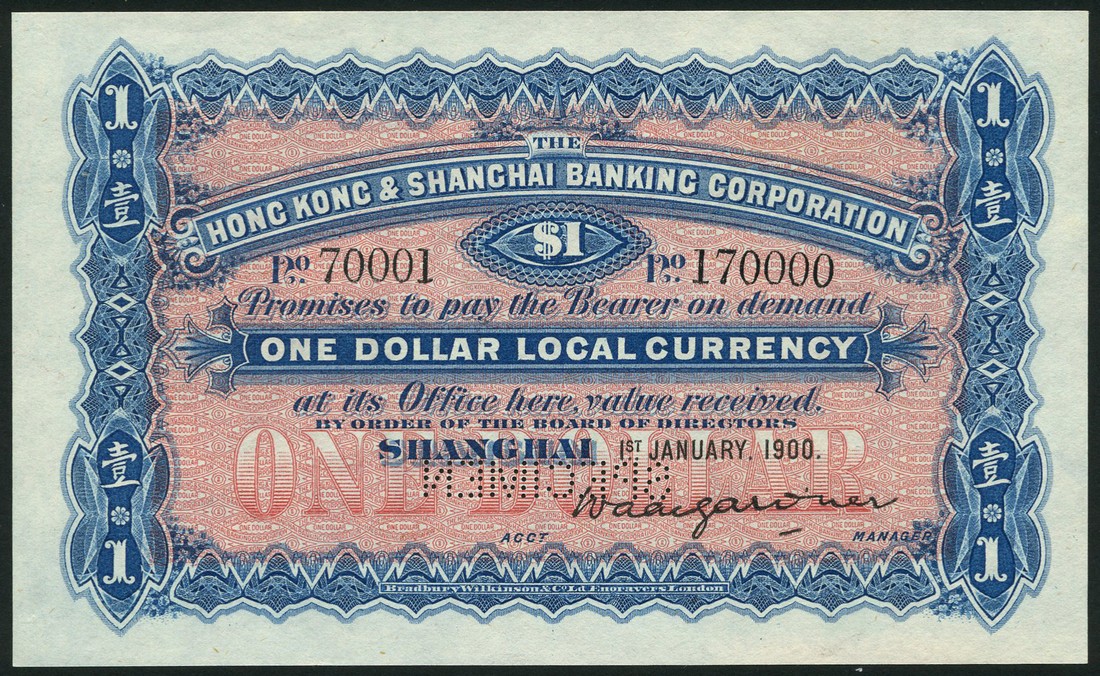 Hong Kong and Shanghai Banking Corporation, specimen $1 local currency, Shanghai, 1 January 1900, serial number 70001-170000, blue and pink, bank title in curve top centre, value in oval frame low centre, value in blue panel at centre and at each corner, printed signature of Wade Gard'ner low right, reverse red, arms at centre, value at left and right