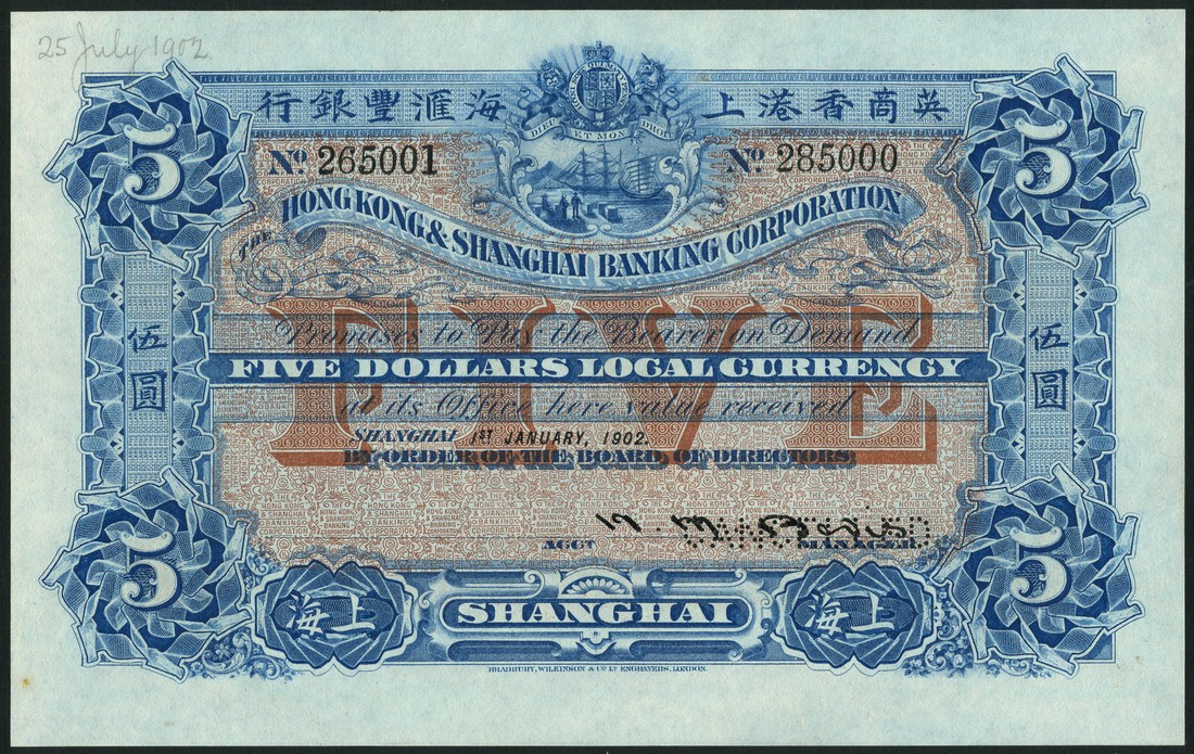 Hong Kong and Shanghai Banking Corporation, specimen $5, Shanghai, 1 January 1902, serial number 265001-285000, blue and pink-brown, value in brown underprint at centre, arms top centre, value at each corner, printed signature of H.M.Bevis low right, reverse red, Ceres and cherubs at centre, value at each corner
