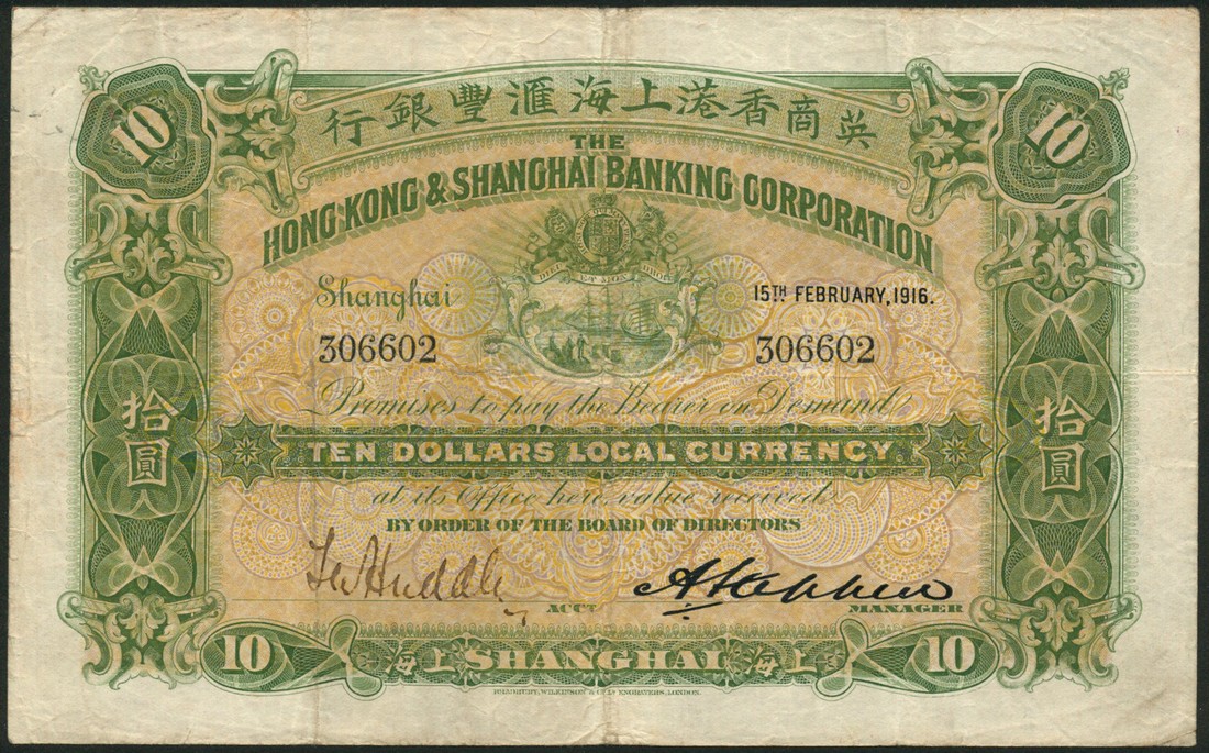 Hong Kong and Shanghai Banking Corporation, $10, Shanghai, 15 February 1916, serial number 306602, green and yellow-orange, arms of the bank top centre, manuscript signature low left, printed signature low right of A. Stephen, reverse purple, cherubs and allegorical symbols at centre, value at left and right