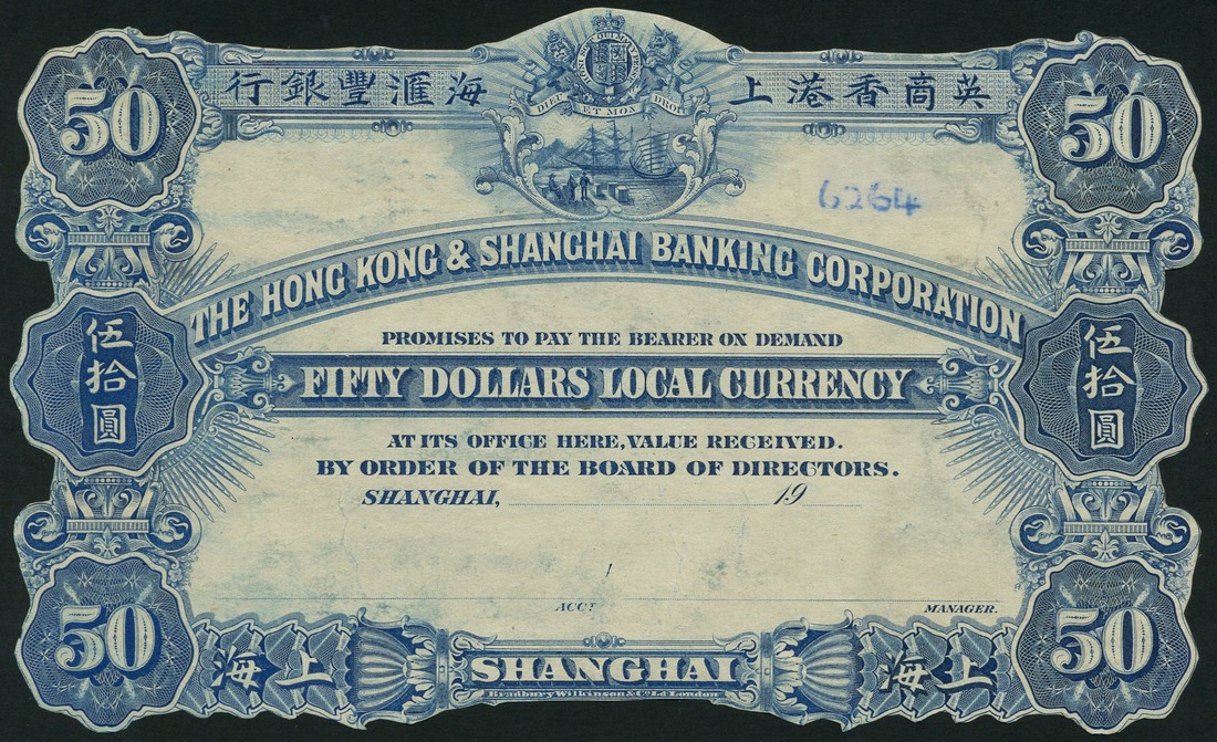 Hong Kong and Shanghai Banking Corporation, China, obverse die proof for $50, Shanghai, 19- (ca 1914), blue and white, bank arms top centre, value at centre and at each corner