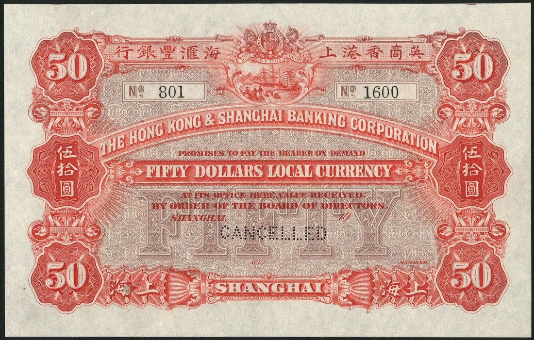 Hong Kong and Shanghai Banking Corporation, specimen $50, Shanghai, 19- (ca 1923), serial number 801-1600, red and grey, arms top centre, value low centre and at each corner, reverse red, maiden (Britannia with globe), value at left and right