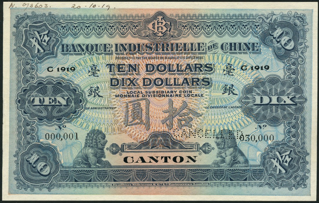 Banque Industrielle de Chine, specimen $10, Canton, 1919, serial number 000001-030000, blue, mauve and green, Chinze low left and right, Bank initials top centre, value at centre, CANTON in black low centre, reverse purple and pale green and blue, City gate at right, value at each corner