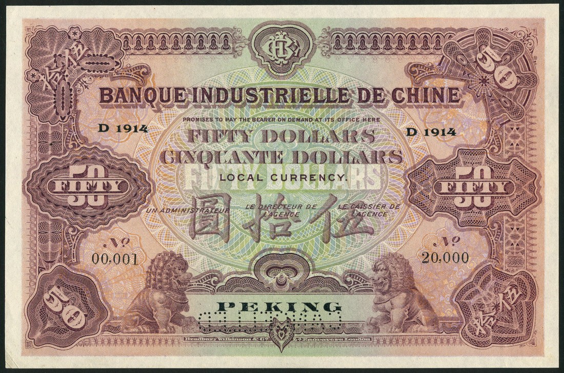 Banque Industrielle de Chine, specimen $50, Peking, 1914, serial number 00001-20000, purple, green, pale green and blue, ornamental lion (Chinze) low left and right, value at centre and at left and right, PEKING low centre, reverse purple, green and pale orange, pagoda at left