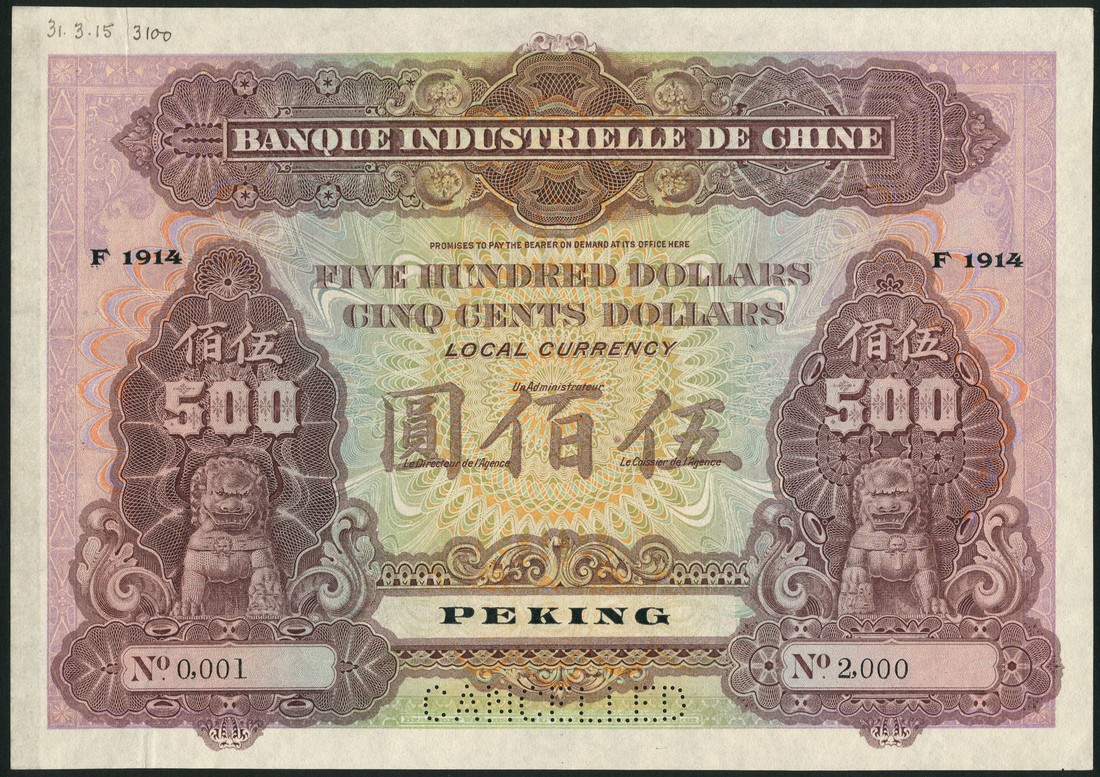 Banque Industrielle de Chine, specimen $500, Peking, 1914, serial number 0001-2000, purple, mauve, green, pale orange-brown, ornamental lion (Chinze) low left and right, value at centre and at left and right, PEKING low centre, reverse purple and mauve, ornate gateway top centre