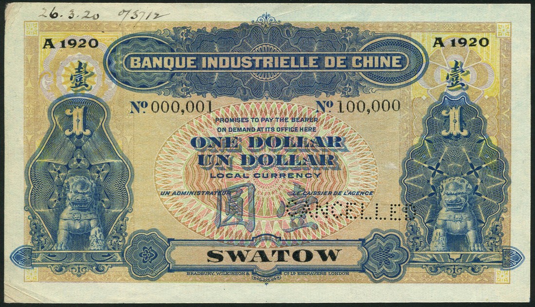 Banque Industrielle de Chine, Swatow, specimen $1, Swatow, 1920, serial number 000001-100000, blue, yellow ochre and pale pink and green, ornamental lion (chinze) low left and right, SWATOW in text low centre, reverse purple, pale red and pale green, ornamental archway top centre